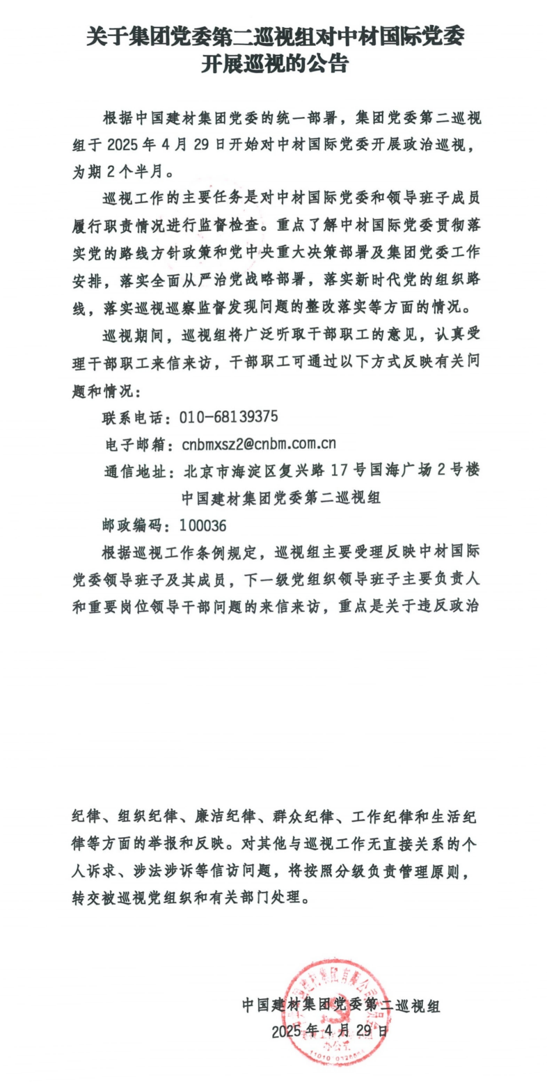 关于集团党委第二巡视组对中材国际开展巡视的公告